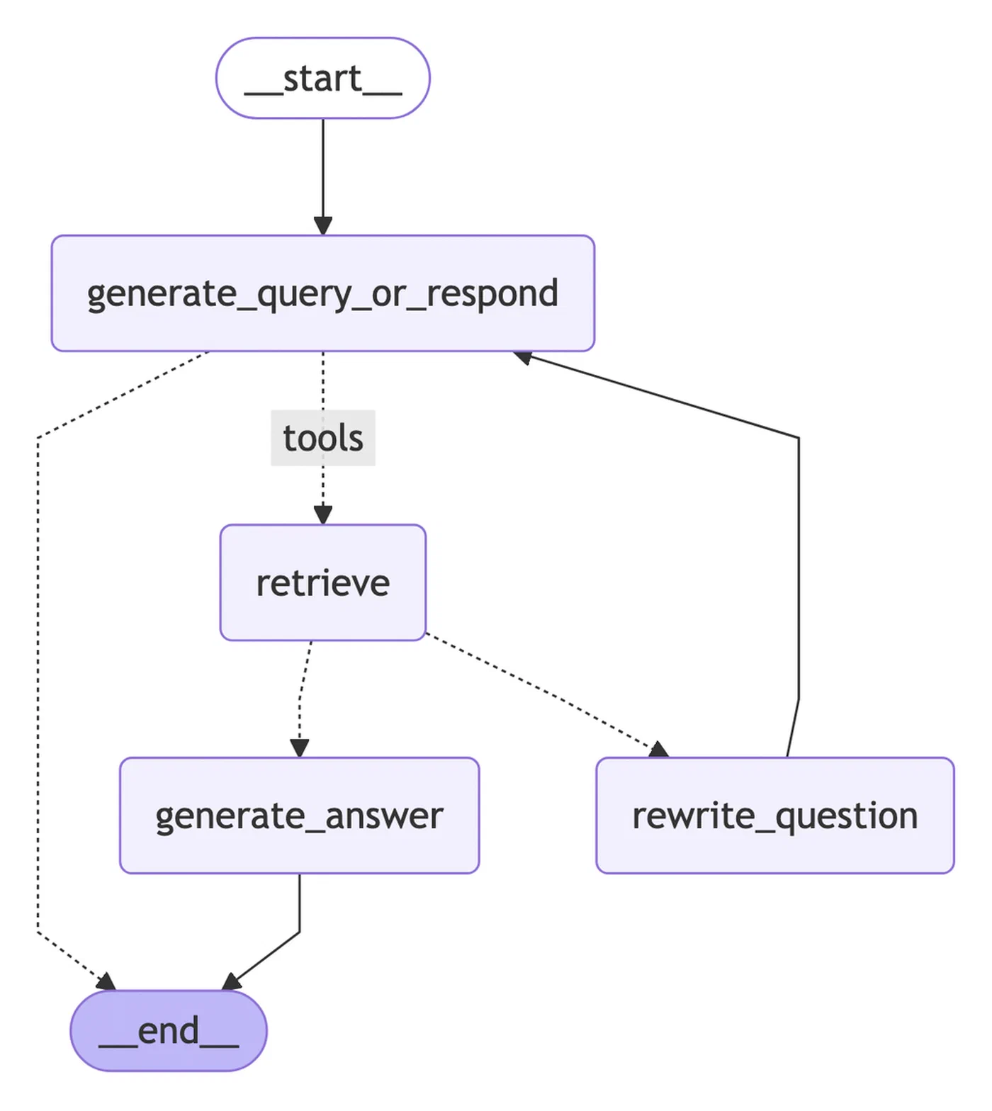return "\n\n---\n\n".join(formatted)Build the graph with nodes for the agent (LLM reasoning), tools (tool execution), and a conditional router:
