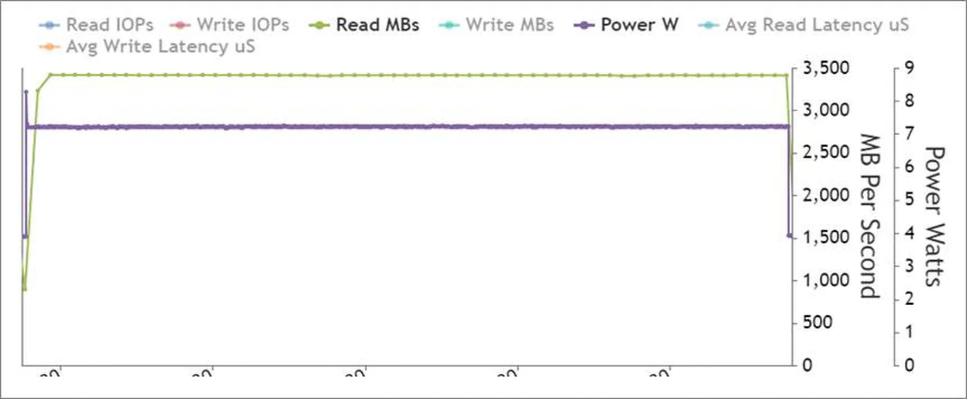 --group_reportingThis test saturates the NVMe controller with large-block sequential reads using four parallel jobs and a queue depth of 64 operations. Expected results: 12,000-14,000 MB/s on Gen5, 6,500-7,000 MB/s on Gen4, 3,000-3,500 MB/s on Gen3.