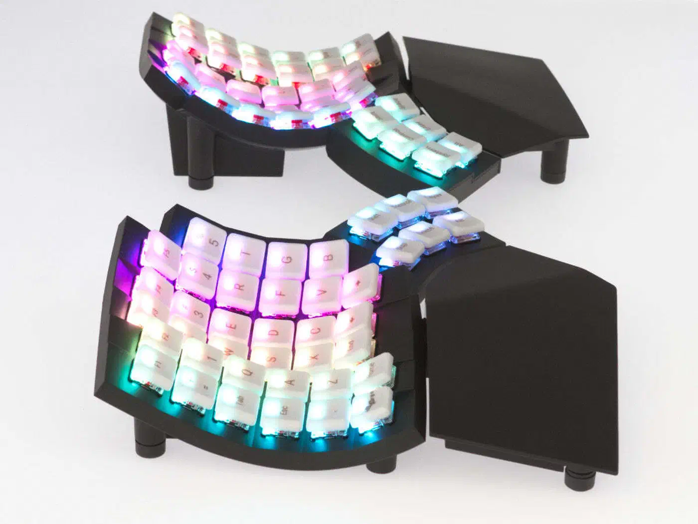 Build quality is substantial. The full ABS case includes integrated palm rests and adjustable tenting via flip-out feet (0-15 degrees). The tenting range is the most limited of the three keyboards here. The Advantage360 is also the heaviest, weighing over 800g per half - this is a keyboard designed for a permanent desk installation, not for travel.