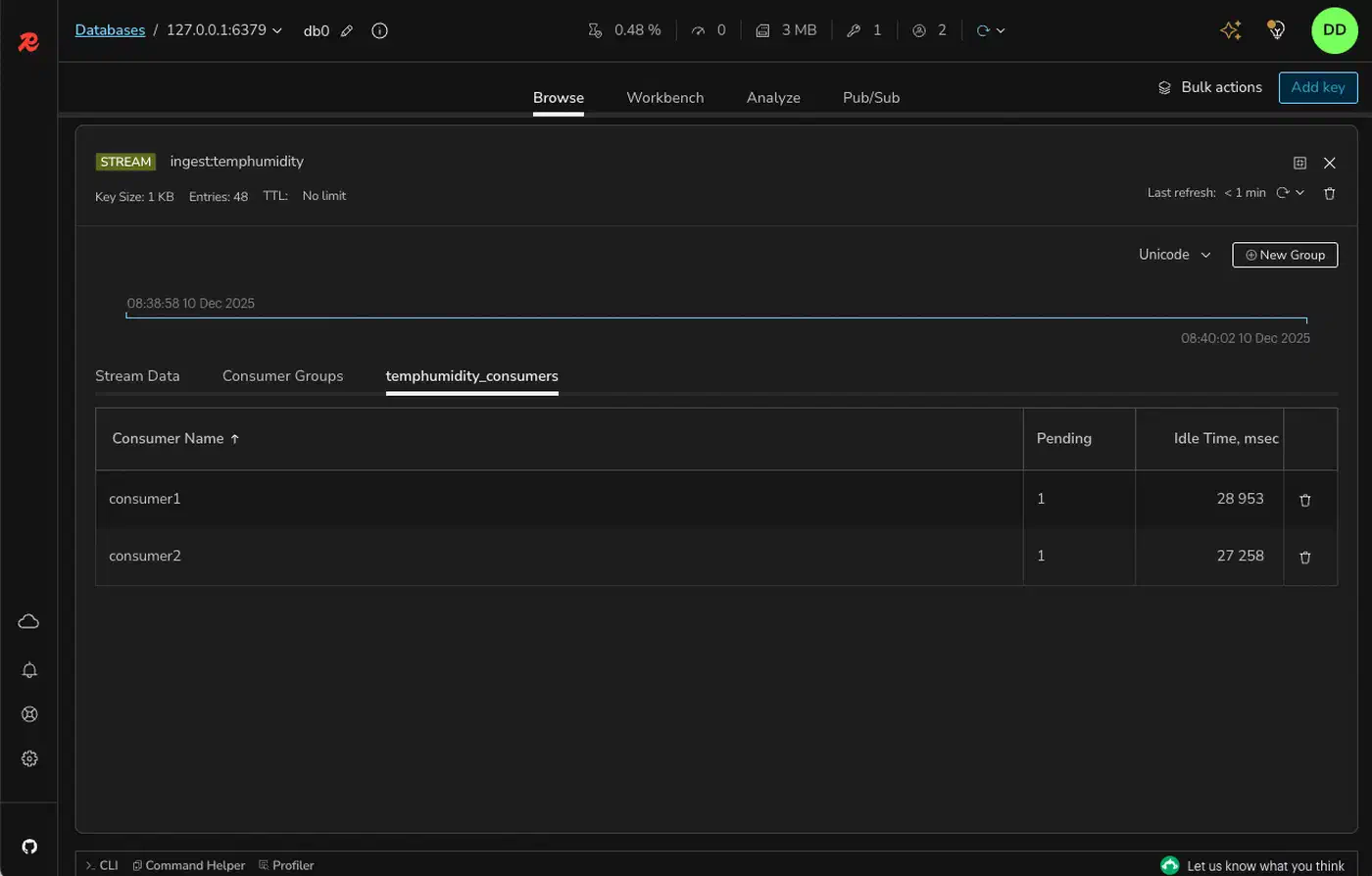 logger.info(f"Reclaimed {len(result[1])} stale entries")To scale, run multiple instances of the consumer worker with different consumer names (consumer1, consumer2, consumer3) in the same group. Redis distributes entries across them automatically. If one instance dies, XAUTOCLAIM in the surviving instances picks up its pending work. To verify this failover behavior before shipping, spin up a real Redis container in your test suite using the patterns from our guide on integration tests with Testcontainers