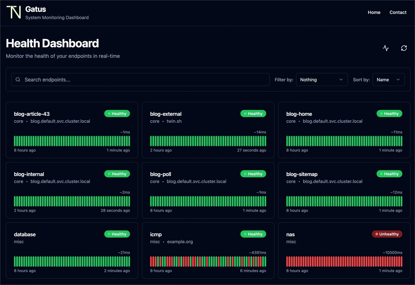 - targets: ["gatus:8080"]The metrics include endpoint health status, response times, and certificate expiration data. You can add custom labels to endpoints using the extra-labels field in the Gatus config for more flexible filtering in Grafana queries.