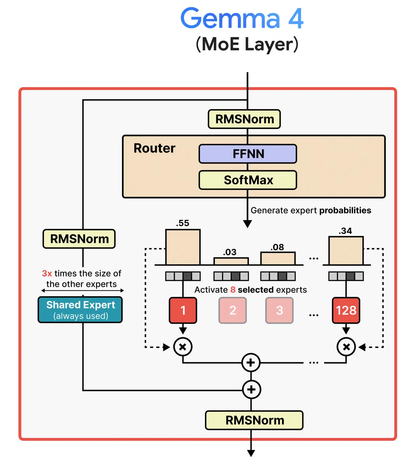 The Gemma 4 26B A4B is Google’s first open Mixture-of-Experts model in the Gemma family, released under the Apache 2.0 license in April 2026. Its architecture is the reason it generates so much interest among people with limited hardware: 128 experts plus one shared expert, with only 8 experts active per token . That means only about 3.8 billion parameters fire during each forward pass, despite the model containing 26 billion parameters total.