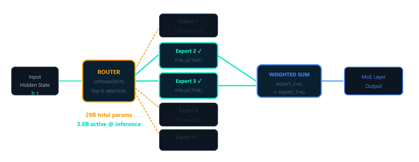 The math on active parameters: 8 of 128 specialist experts fire per token, plus the shared expert, plus all attention layers. That totals roughly 3.8B active parameters per forward pass out of 26B total. All 128 experts must be loaded into memory, but only a fraction performs computation for any given token.
