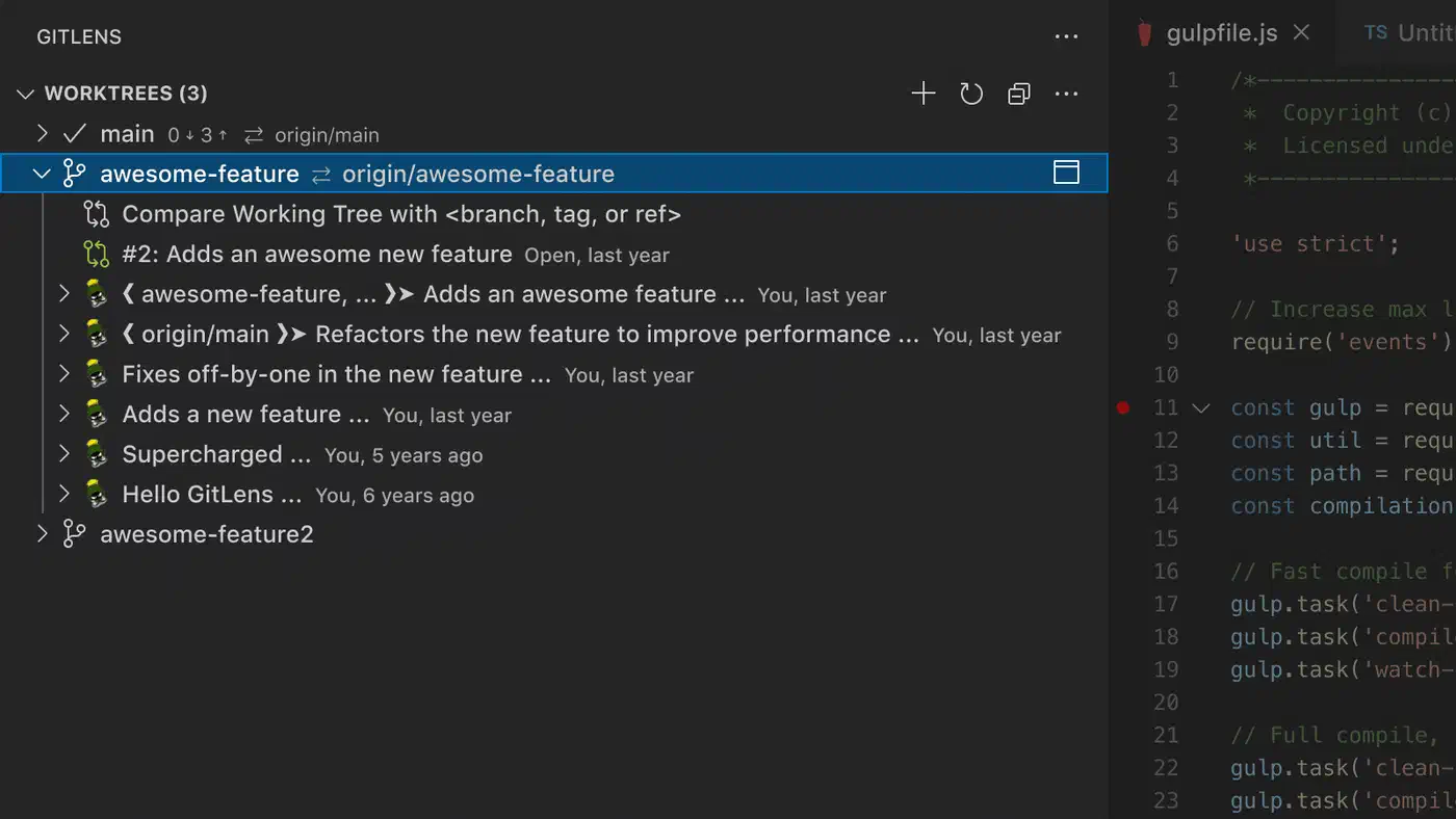 Version 14 of GitLens added a full worktree management UI. You can create, remove, and switch between worktrees without leaving the editor.