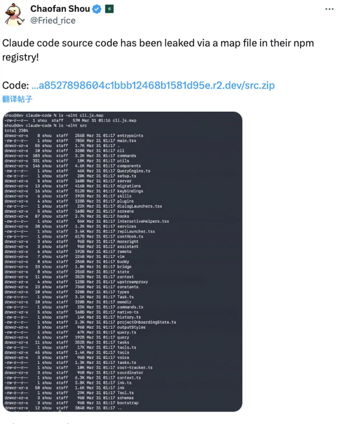 At 4:23 AM ET on March 31, security researcher Chaofan Shou (an intern at Solayer Labs) posted the finding on X with a direct download link. The tweet accumulated over 21 million views. By the time Anthropic pulled the package version and locked down the R2 bucket, the code was already being analyzed by thousands of developers worldwide.