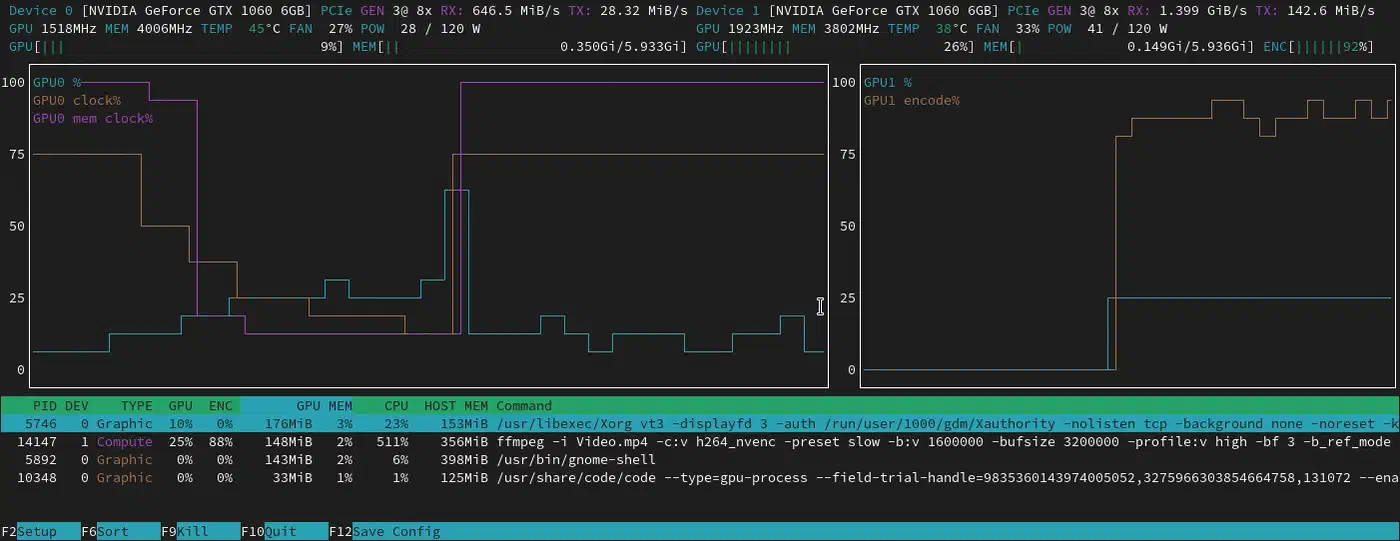 presents GPU information in an htop-style interface with per-process GPU usage. This is the tool to run when you want to know which specific application is hammering your GPU:
