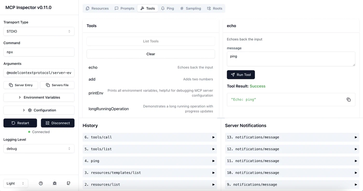 MCP Inspector is worth installing before you write a single line of server code: npx @modelcontextprotocol/inspector. It opens a browser-based GUI that lets you manually send tools/list and tools/call requests against any server, and shows the raw JSON-RPC exchange in real time. Running it against your server before connecting an actual LLM catches schema errors and handler crashes immediately, without the overhead of debugging through an LLM client.