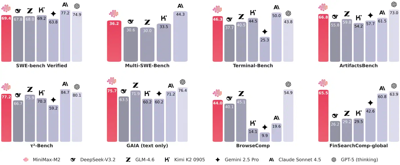Here is the scoreboard, pulled from MiniMax’s technical report and cross-checked against Artificial Analysis: