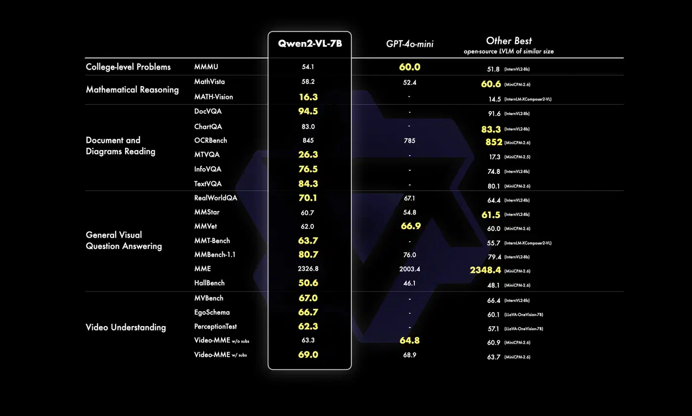 Qwen2-VL is Alibaba’s multimodal model built for visual understanding and reasoning. Where Florence-2 uses structured task tokens, Qwen2-VL accepts natural language: you ask “What text is visible in this image?” or “Describe the relationship between the objects in this scene” and it answers conversationally.